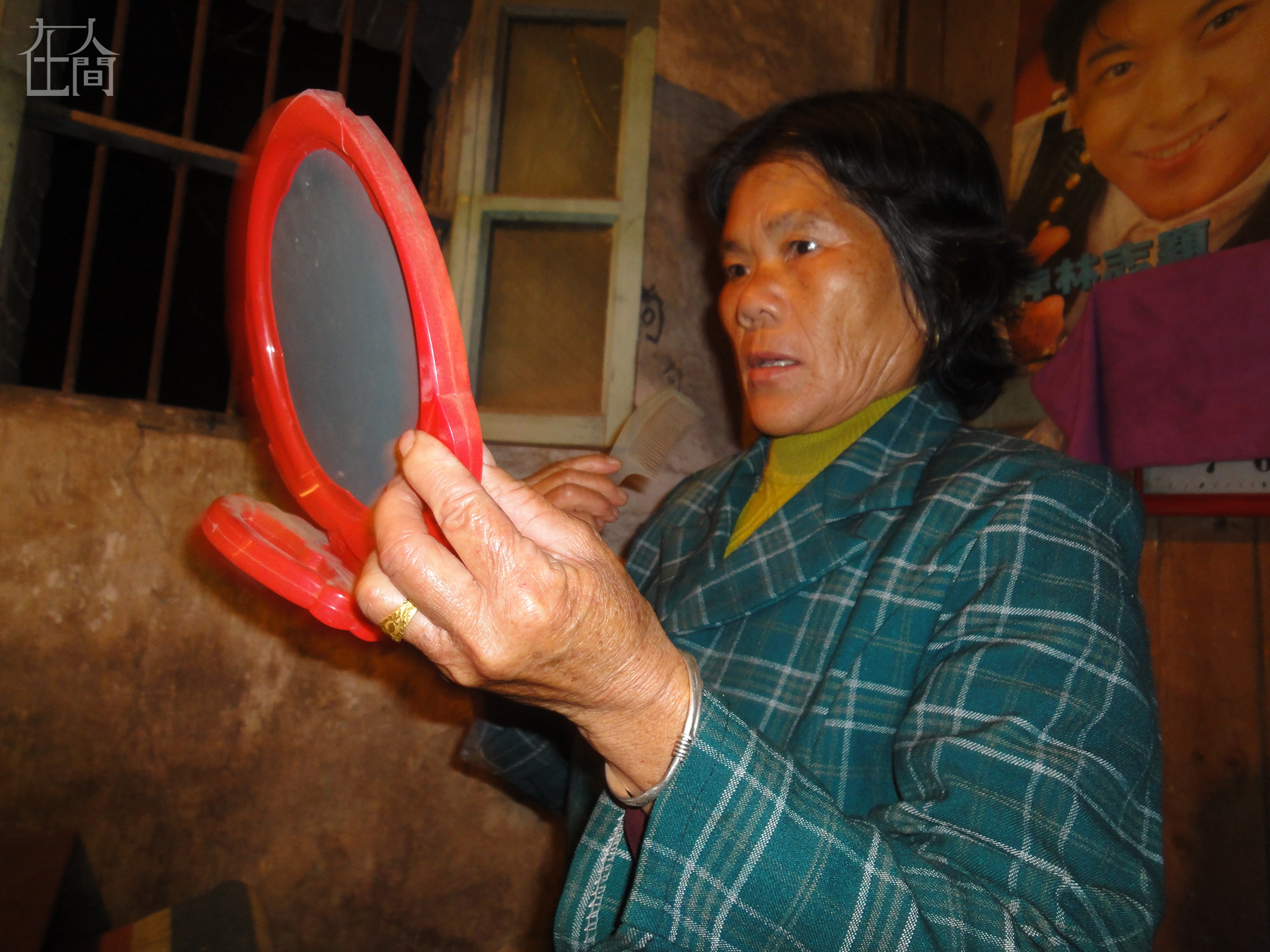 这是我奶奶正在梳头发,她一边梳一边说她的白发又多了。