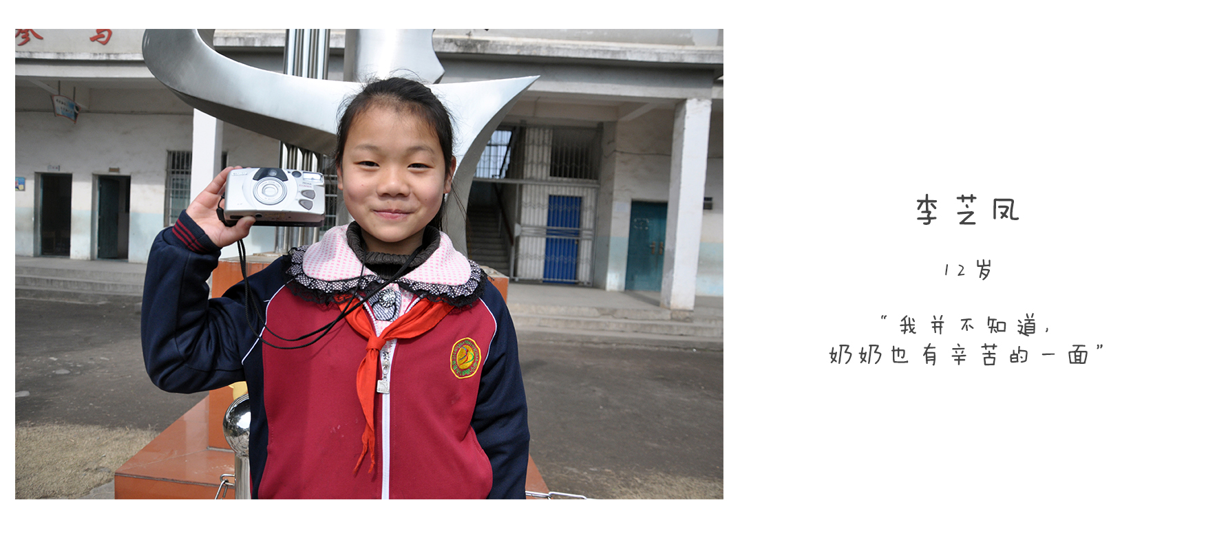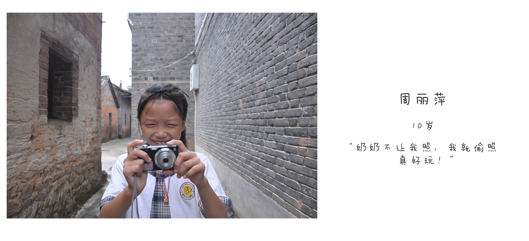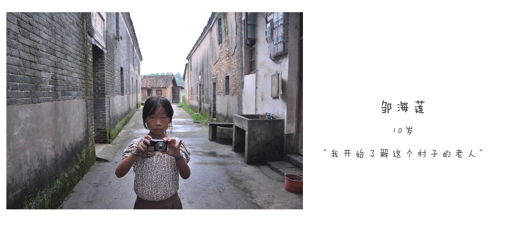 我叫邹海莲,今年(2015年)10岁了,读四年级。 因为我爸爸妈妈要打工养家,加上爷爷奶奶不在身边,所以就把我送到外婆的妹妹家里寄住,外婆的妹妹不愿意被拍,所以我拍了很多邻居的照片。 自从我参加摄影班后,我拍的第一个老人就是邻居家的太婆。拍照后,我开始了解这个村子的老人,这对我来说是一个非常好玩的游戏。