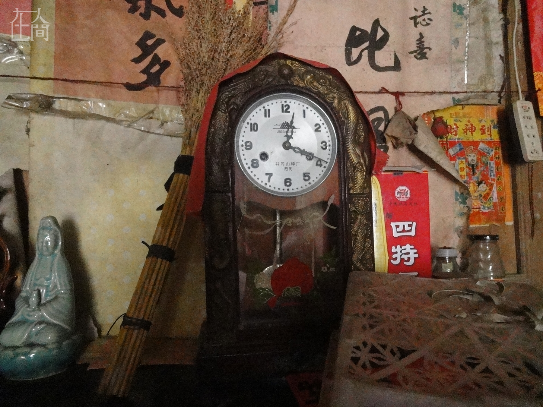 这是邻居太公家里的钟,我在别人家里都没看见过这样的钟,太公说这个钟用了几十年了,现在还能用。它上面的时间是十二点二十分,正是太公太婆吃饭的时间。