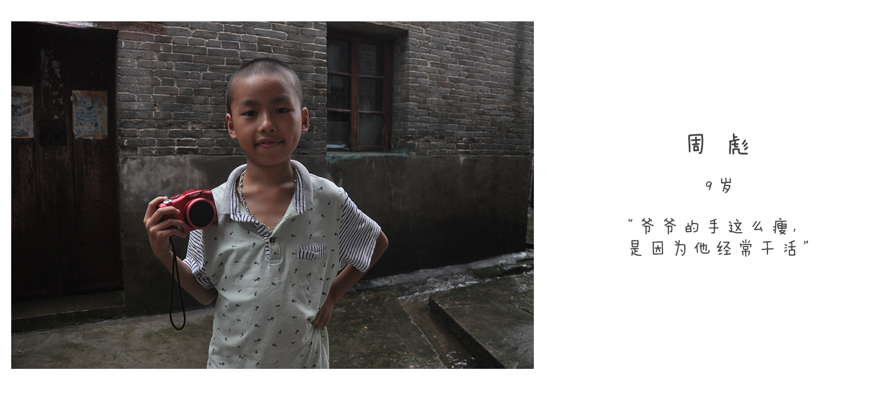 我叫周彪,今年(2015年)9岁了,在读三年纪。我爸爸之前一直在东莞打工,后来回家承包山林,偶尔做水泥工,我妈妈现在还在县城工厂上班。