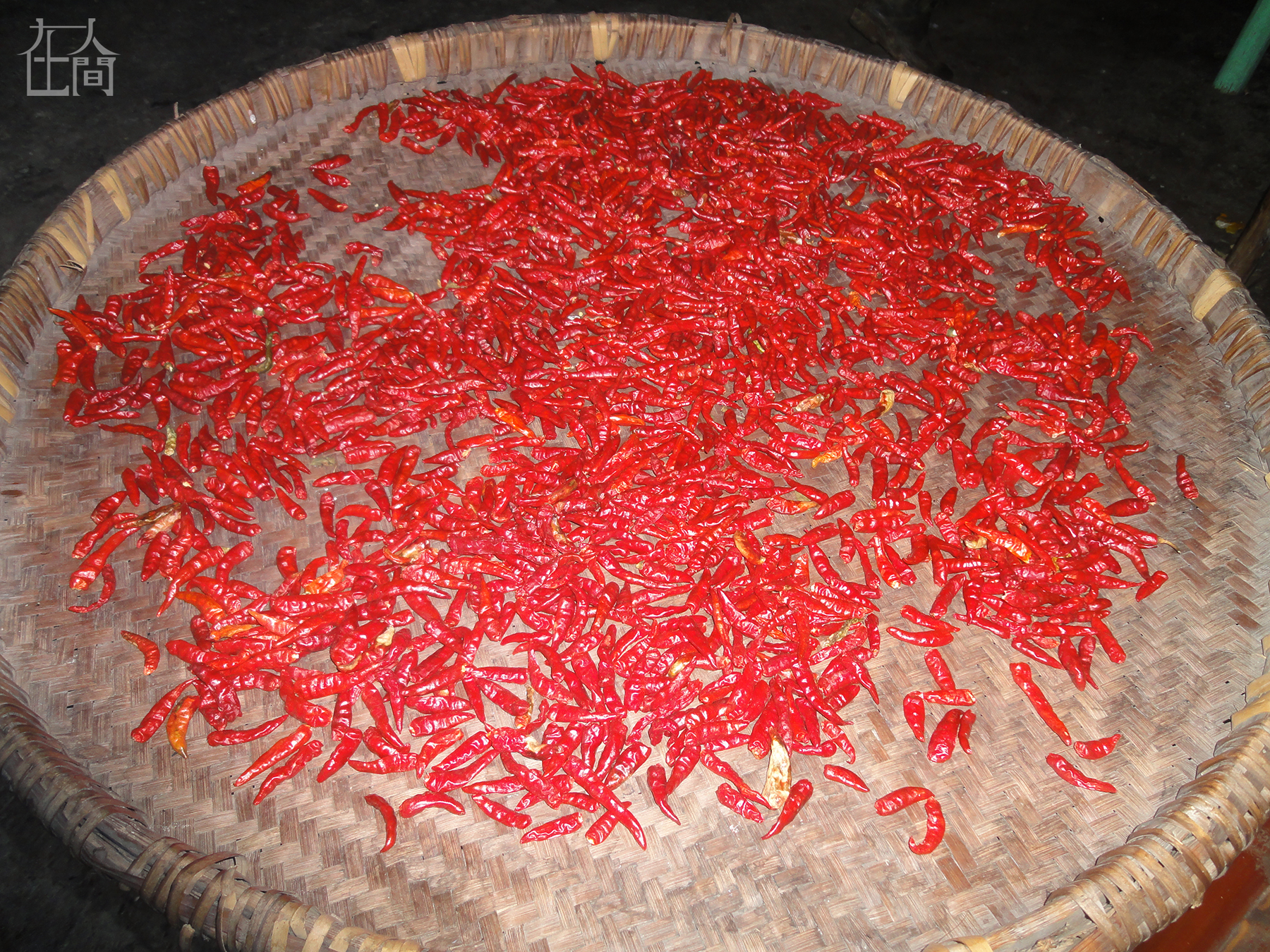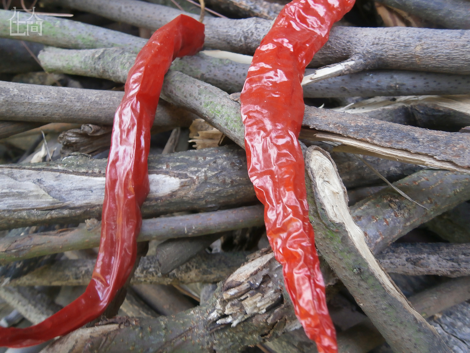 这是太婆晒的辣椒,太婆自己种的,但种得不多,因为太婆老了,动不了了,又要带孙子,没有时间。这个辣椒可以用来炒肉,也可以用来炒青菜。太婆把这两根摆放得非常好看,我就拍了。