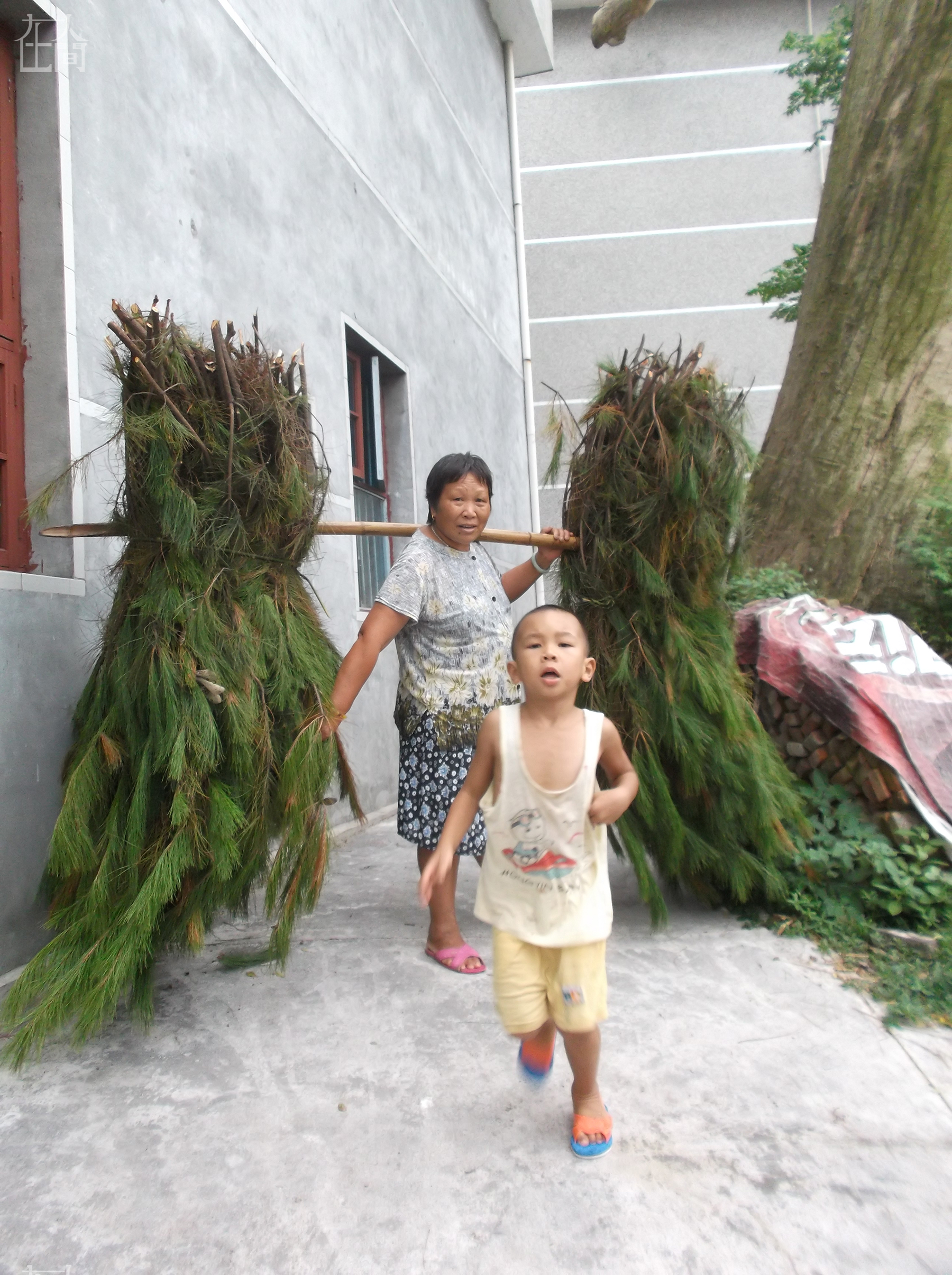 这是我爷爷奶奶一起去山上砍的柴,奶奶刚刚担回来,我看见了就拍了下来。爷爷也担了一担,但我没有拍到。这一担柴晒干了能烧四五天,烧完后,爷爷奶奶又要去山上砍,很辛苦。前面的是我的弟弟,有人追,所以我弟弟跑了起来。