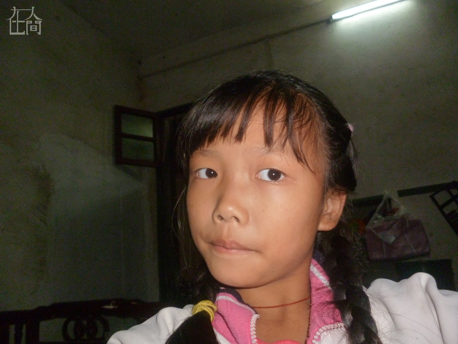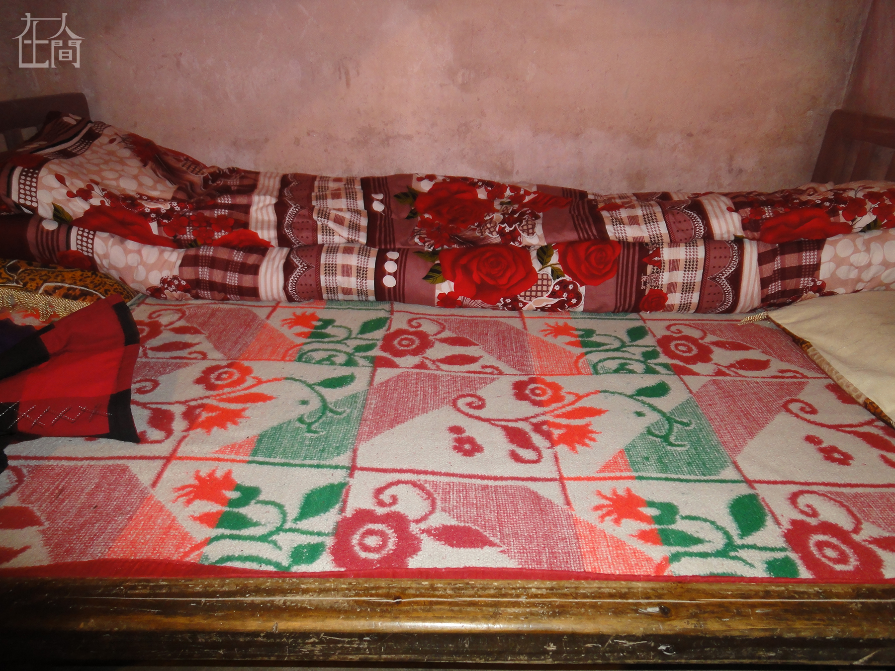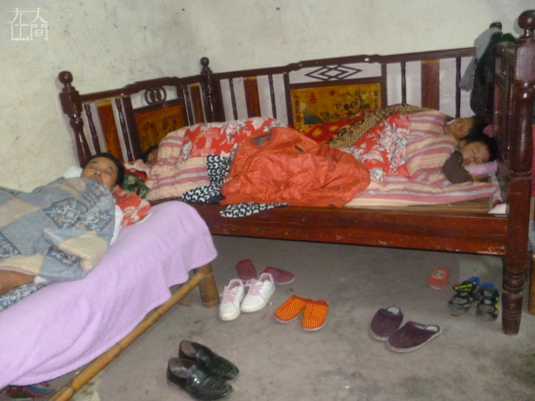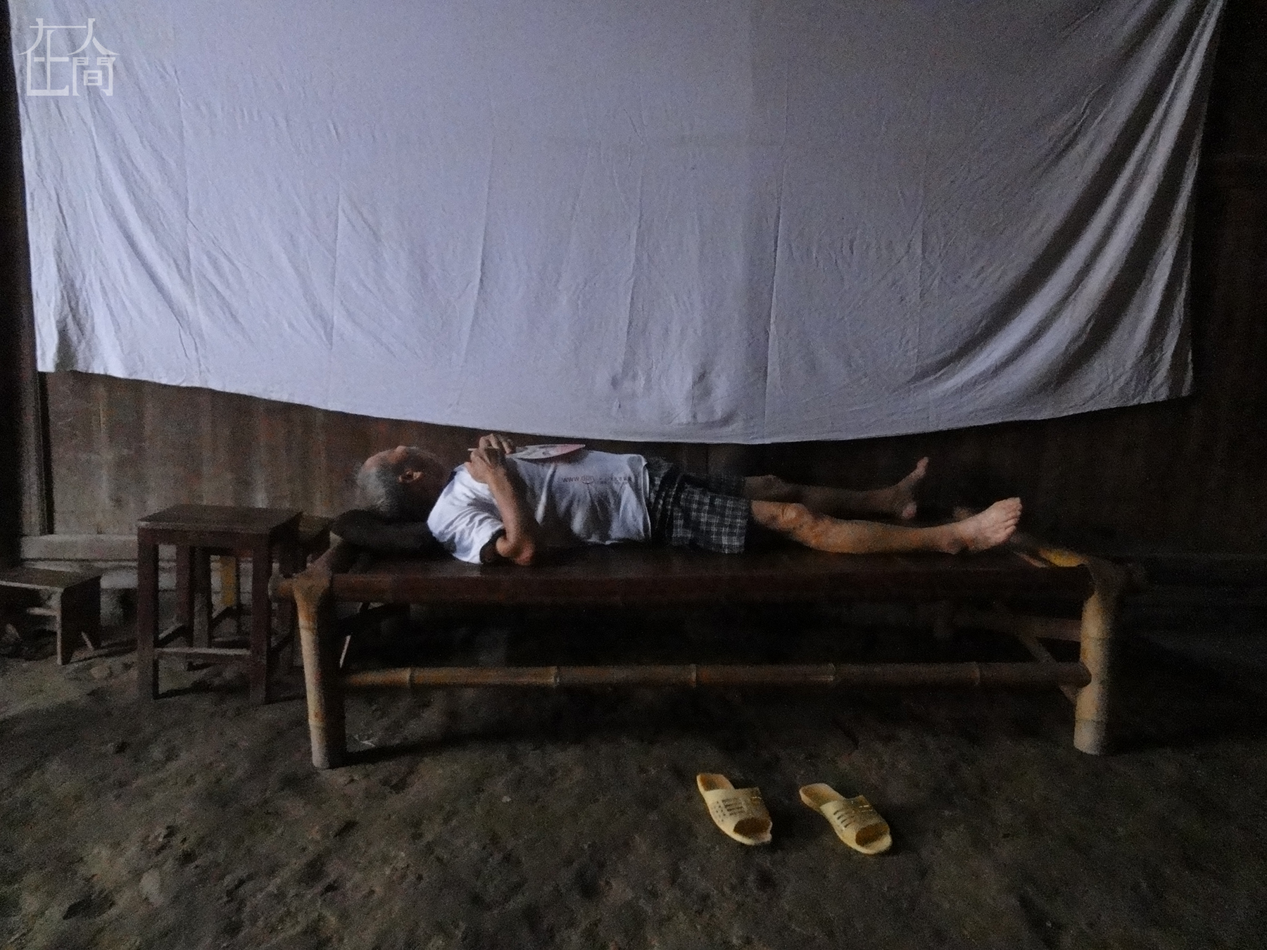 这是我在暑假照的,这个地方是暑假教拍照的教室,上面的白布是用来放(投影)照片的。这个老人是房子的主人,他当时累了就躺在那里睡觉。