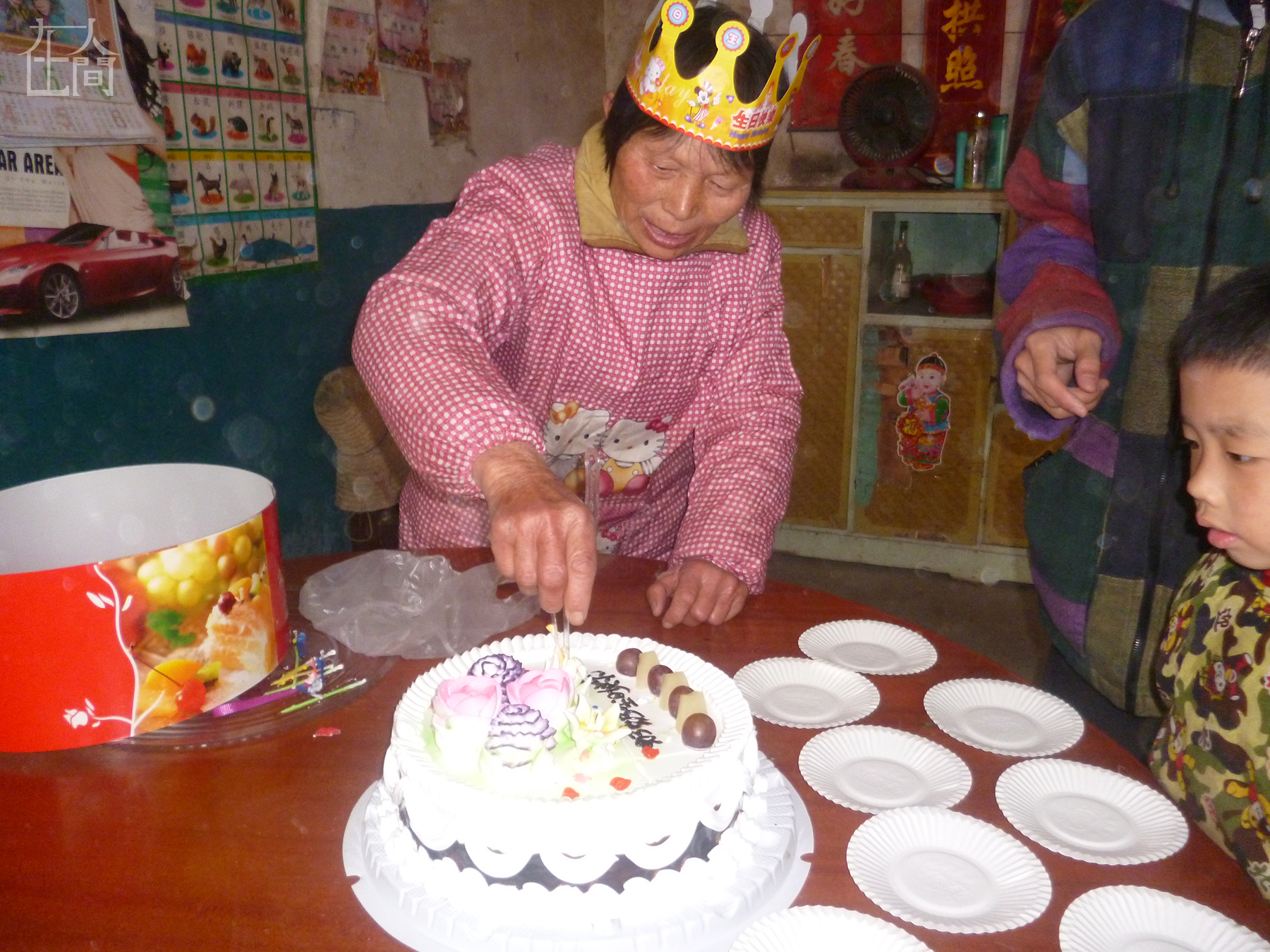 这是我奶奶过70岁生日的时候,她正在切蛋糕,蛋糕是摄影老师买的。这是我奶奶第一次吃生日蛋糕,她很开心。