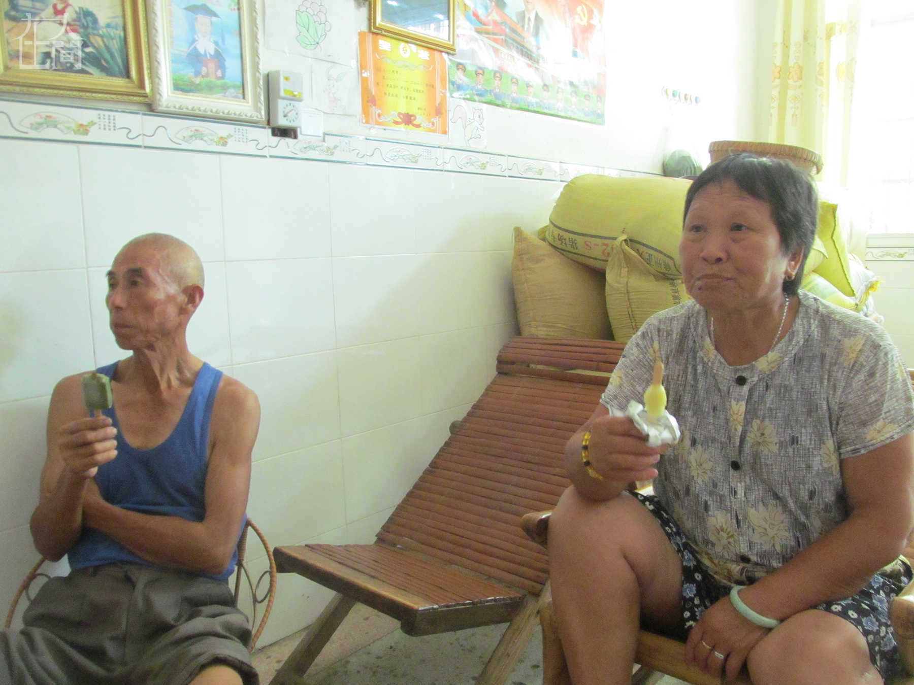 夏天时,我爷爷奶奶一边看电视一边吃冰棒。冰棒是几天前买了放在冰箱里的,本来是爷爷奶奶买给我和弟弟吃的,每次会买很多,5毛一根的那种,我和弟弟没吃完,爷爷奶奶就拿来吃,平时他们是不怎么吃的。