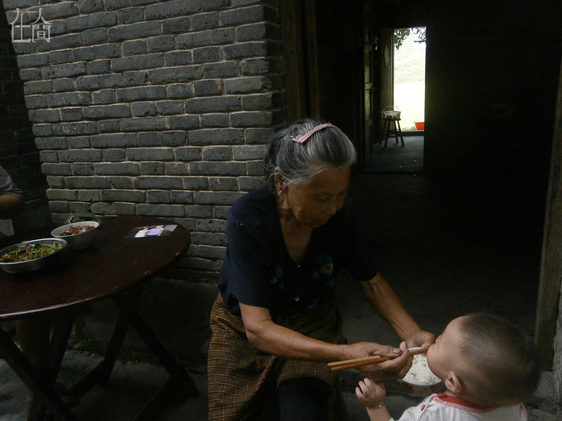 太婆在喂弟弟吃饭,太公在后面吃饭。太公太婆的儿子在深圳卖木桶饭,只有春节的时候才回来,所以平时就只有太公太婆带着孙子在家里。桌子上那个是我拍的照片,老师洗出来后,我送给太公太婆,太公太婆很高兴。