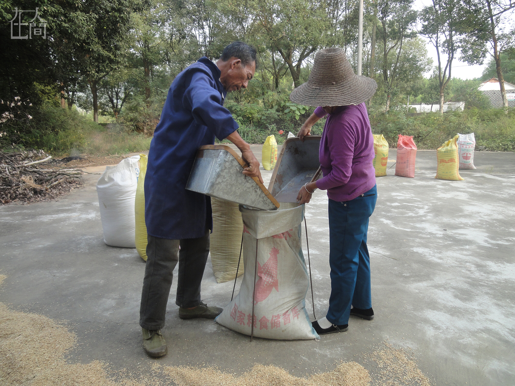 爷爷奶奶正在收稻谷,他们种了8亩田,一年能卖一万多块钱。因为他们经常吵架,难得有机会在一起,所以我就拍了他们。