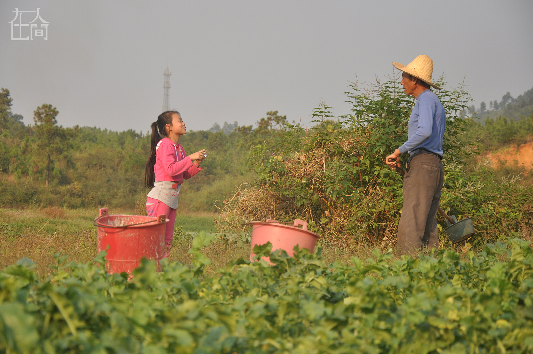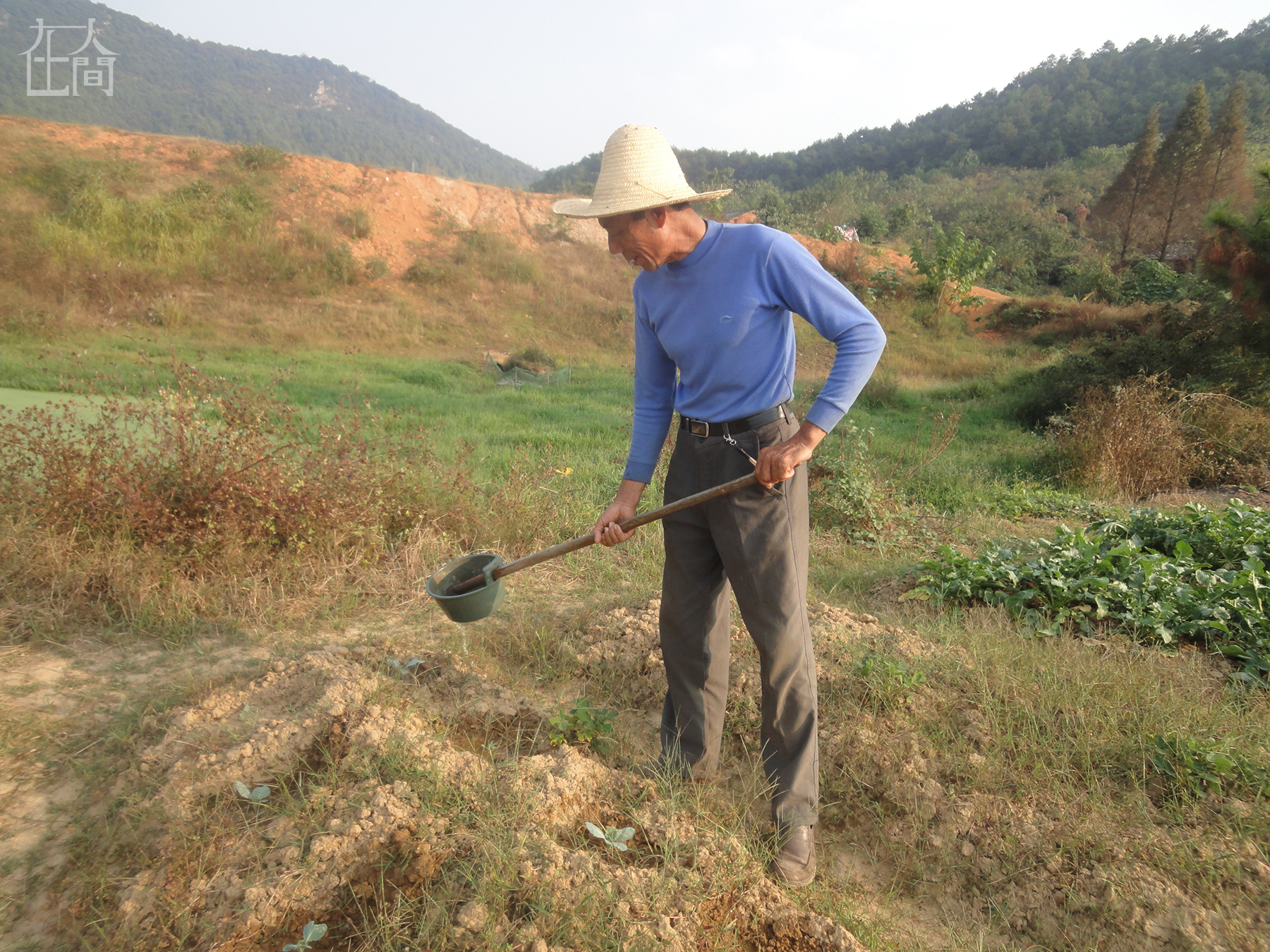 这是我爷爷,那个时候正好是星期五下午,我刚刚放学回家,爷爷在菜园给小饭菜浇水。这些菜是自己吃的,不用来卖。
