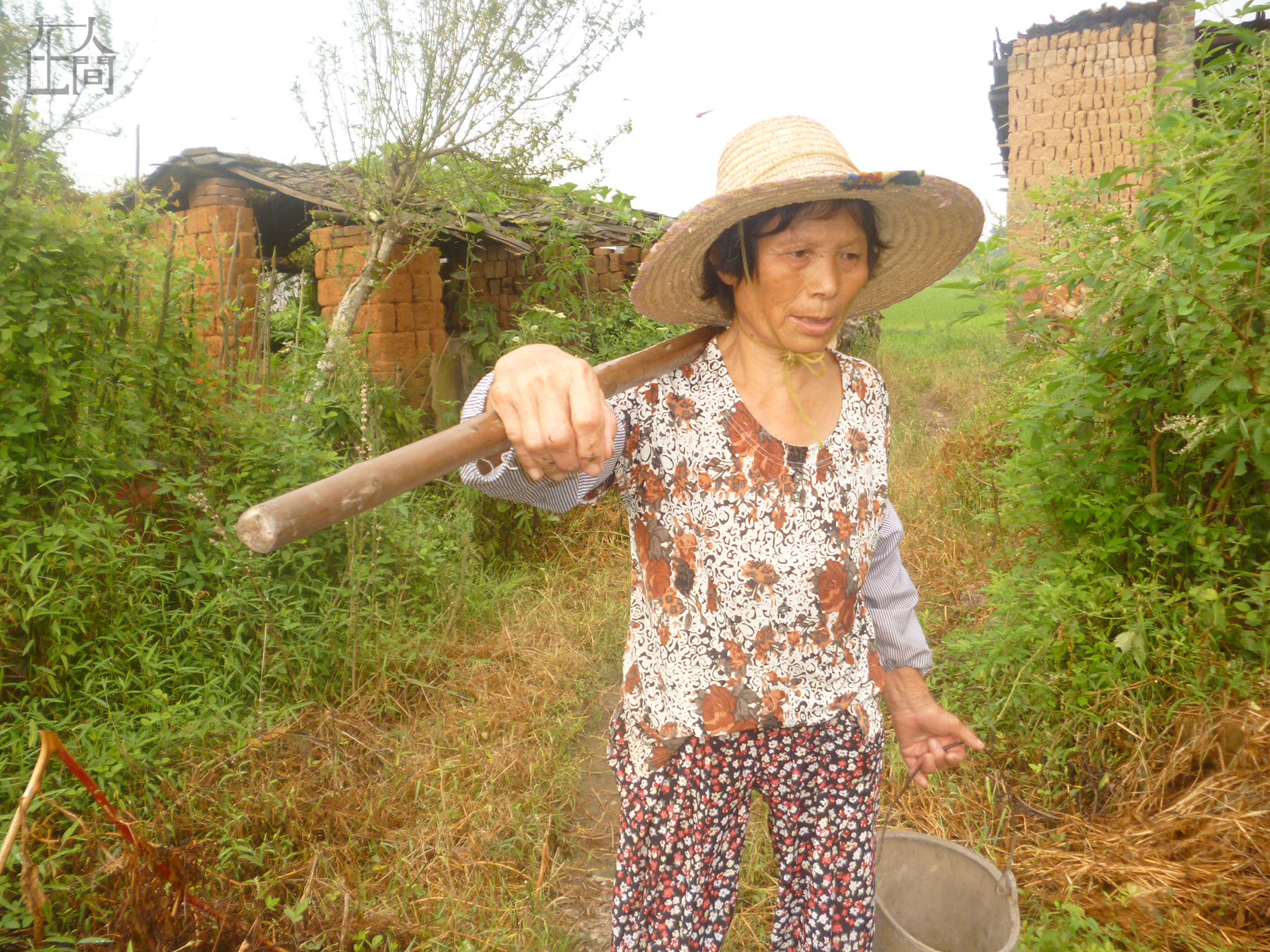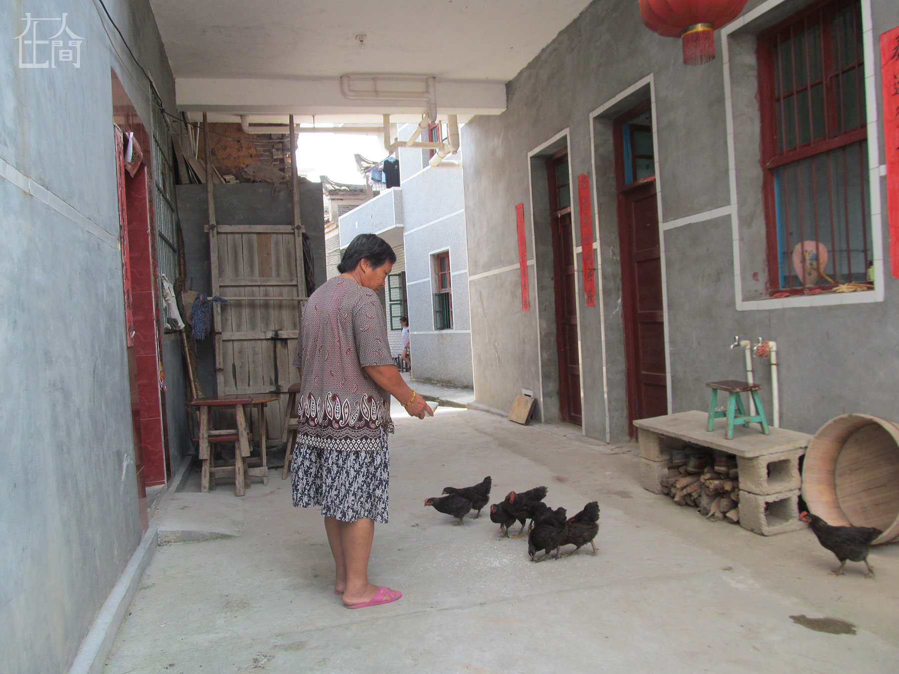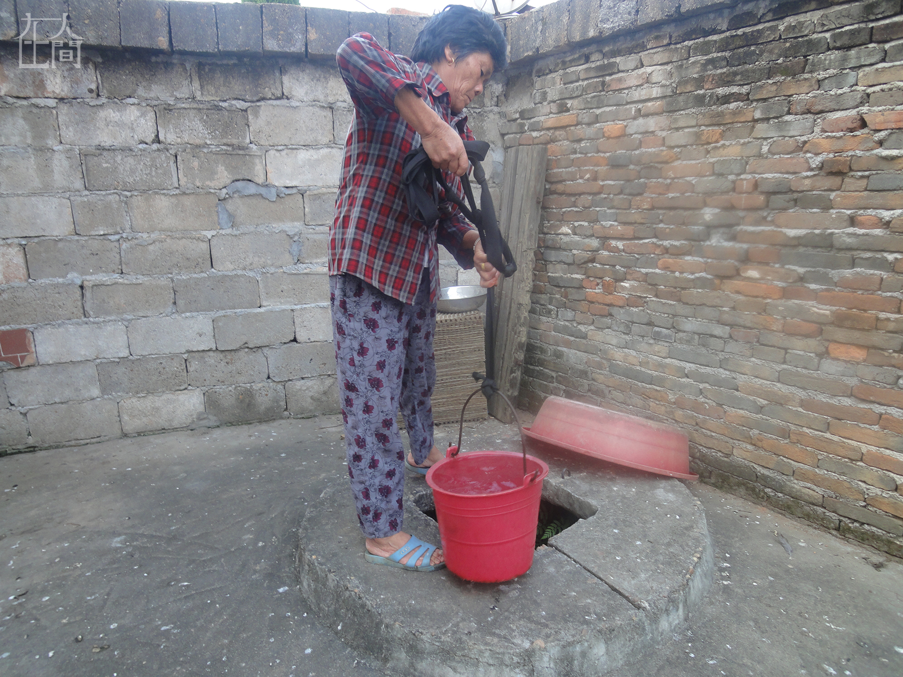 这是我奶奶,她正要吊水洗菜。这口井是爷爷奶奶花钱请人挖的,但没有装压水的机器,所以每次用水都要用桶吊起来。