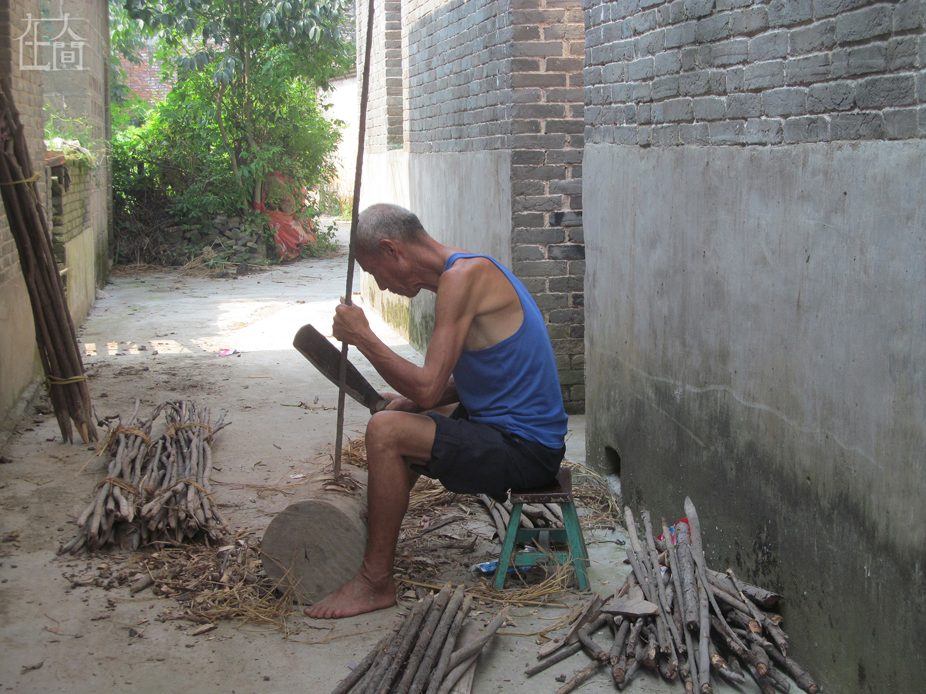 爷爷在削竹子,插在菜园子里,豆角就可以爬上去了。