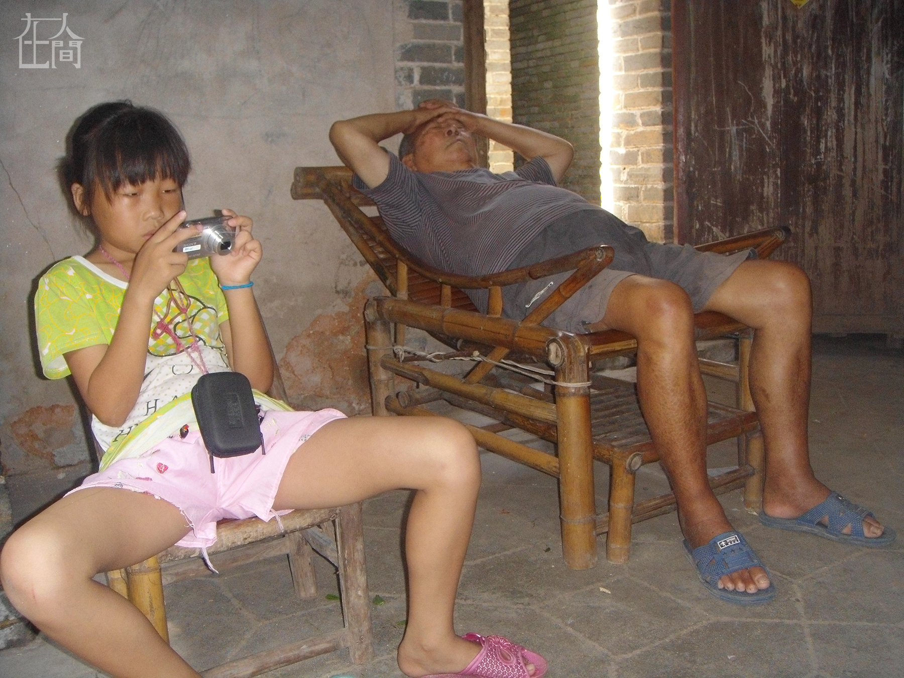 因为竹床被太婆和孙子睡了,睡房间里又热,所以太公就在椅子上躺着睡觉。太公在热天的时候,白天也睡觉,跟太婆一样,不知道是不是跟他们老了有关系。这张照片是我同学邹茜拍的,当时我见他们睡着了,就坐在那里看照片,邹茜就拍了我和太公。