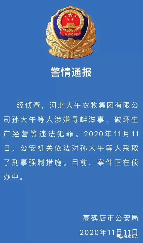 11月11日,据保定市公安局官方微信消息,经侦查,河北大午农牧集团有限公司孙大午等人涉嫌寻衅滋事、破坏生产经营等违法犯罪。2020年11月11日,公安机关依法对孙大午等人采取了刑事强制措施。目前,案件正在侦办中。