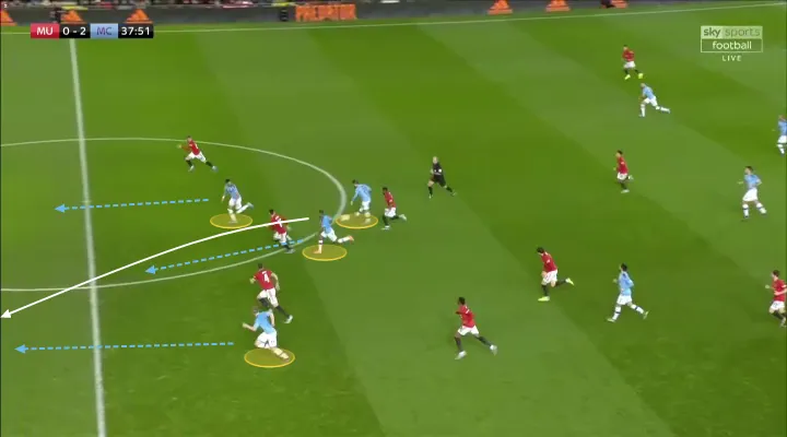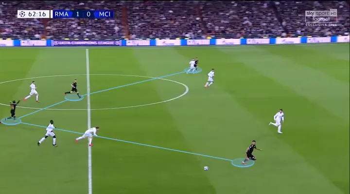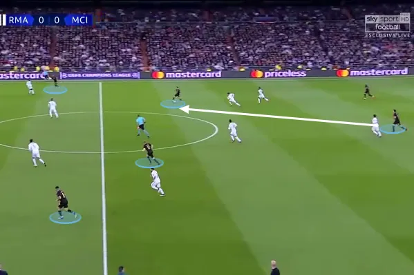 “我觉得我们上半场的发挥非常完美,”B席在赛后表示,“如果把握机会的能力再强点,我们甚至可以带着4到5球的领先进入中场休息。”德布劳内也解释过这不是全新的战术。“有时候遇上采取盯人防守的队伍,比如卡迪夫城、曼联等,我们就会采用这种策略。瓜帅来的第一年,我们在客战巴萨(2016年10月)的时候就这么踢的,所以算下来这套战术我们也用过好几次了,”丁丁回忆说,“贝尔纳多回撤后,中场就形成了4打3的局面,这样对手就面临抉择,如果后卫往上压,防线就会出现空当,如果蹲坑不动的话,B席那边就空了,无论怎样我们的目的都达到了。”这个套路屡试不爽,所以在联赛杯之后又一场客场关键战——2月份在伯纳乌的欧冠比赛中,瓜迪奥拉又故技重施。不过这一次与在老特拉福德相比,他启用了一名正式的前锋热苏斯,替代了打左边的斯特林,也取得了不错的效果。尽管换上了正经前锋,但是B席依然占据箭头位置;尽管启用了前锋队员,但那个人却不是曼城历史最佳射手——阿圭罗。不过这一次曼城的阵型也稍有变化,用“无锋阵”来形容更加贴切,并且更接近于一个4-2-4-0,而非4-3-3-0。前场4名攻击手排成一个U形阵势,热苏斯和马赫雷斯分列两翼,丁丁和B席的位置则稍稍靠后一些。上半场京多安给B席传球的一瞬间,我们可以很明显地看出球员的站位。