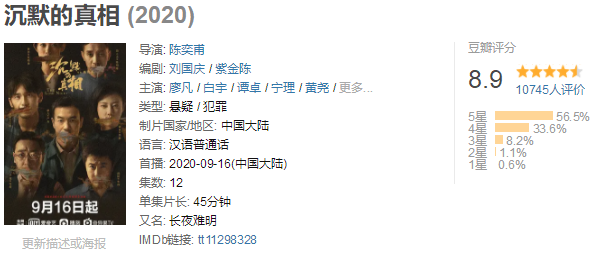 在豆瓣平台,目前《沉默的真相》的评分为8.9分,五星好评占比最高,占56%,而四星好评则占33%,口碑极佳。