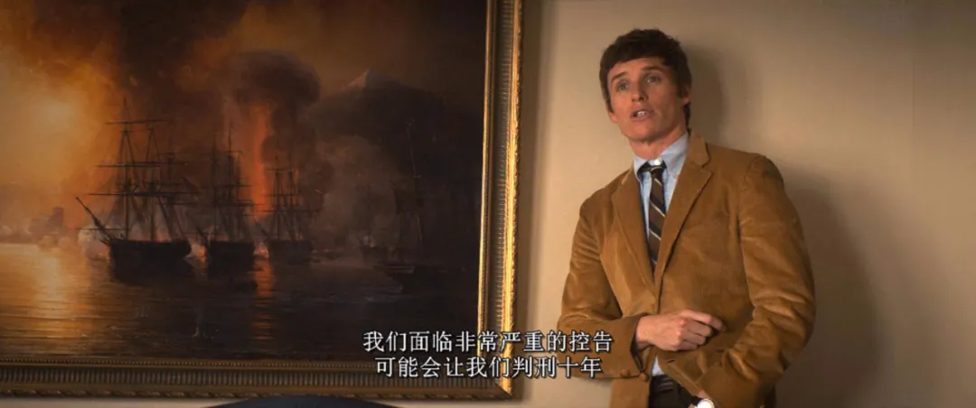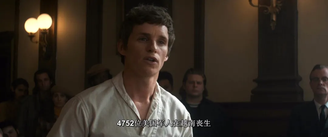 让人看到热血沸腾的是结尾,海登代表七君子陈词,因为在庭审过程中,他一直都尊重法庭,法官希望他简短一点,要表现出尊敬和悔意,而海登的陈词让人意外,他念起了在越战中死去的4752个美国军人的姓名、年龄,正是因为他们公然反对越战,才会被起诉。