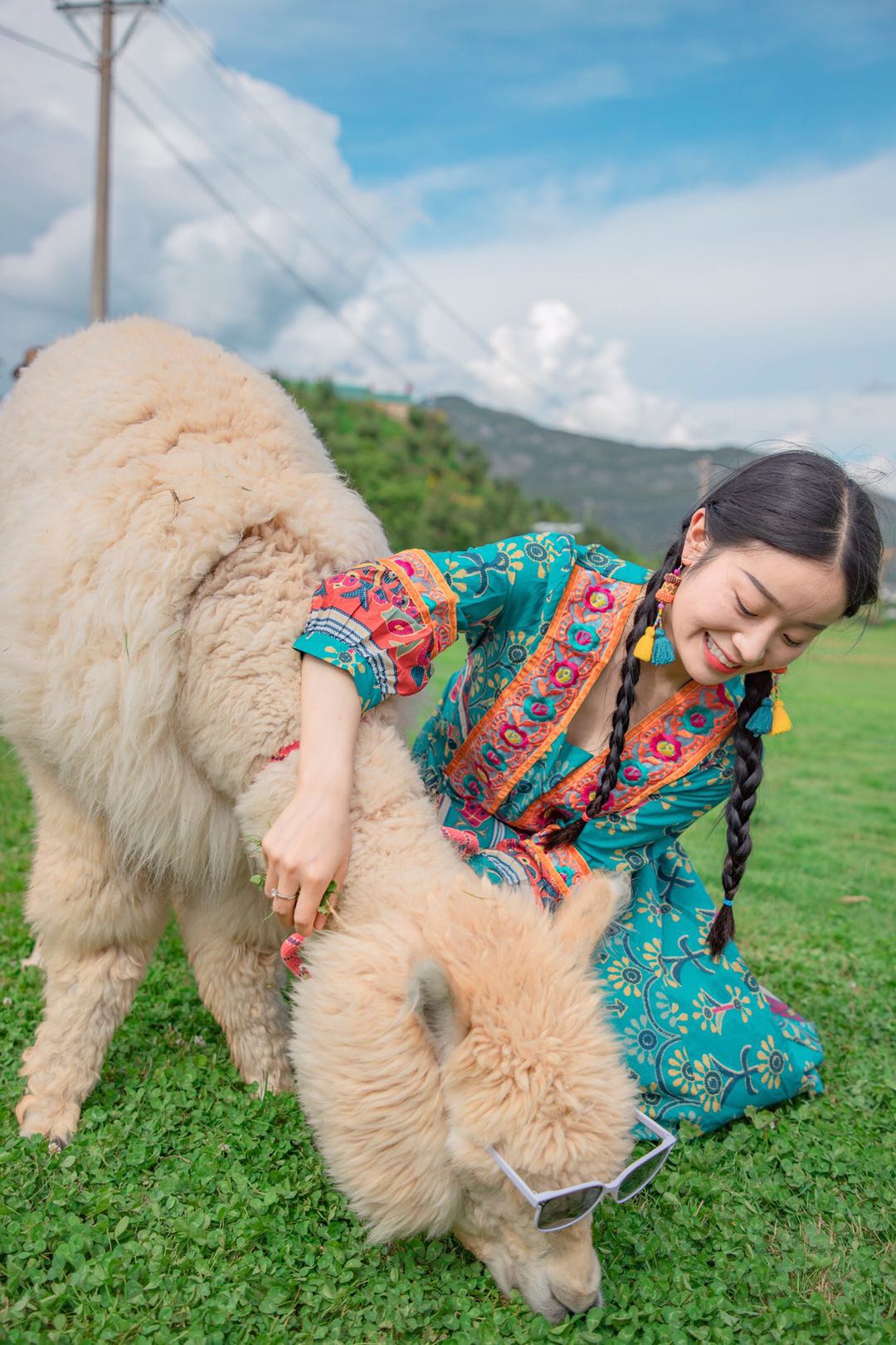 不论是日常拍照还是旅行拍照,经常会看到一些可爱的小动物,这个时候就不要吝啬你的爱心,大可以和它们来场有爱的互动,像下面的女士一般,蹲下和动物互动起来,不仅能拍到您自然好看的一面还能展现出你的满满爱心。