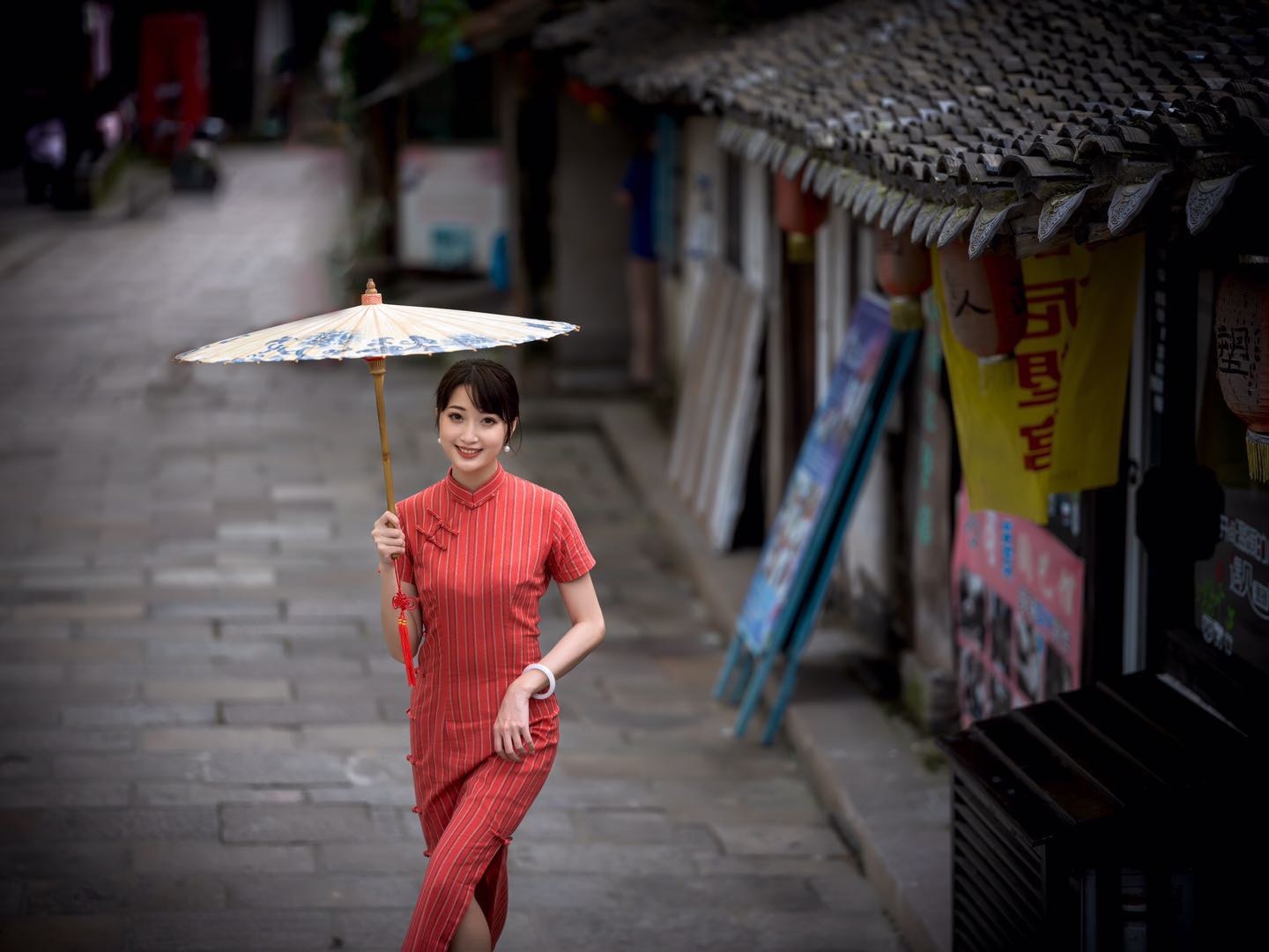 当中年女士在拍摄旗袍题材的人像照时,气质和优雅感很重要,这种感觉和韵味可以通过一些姿势和表情来营造出来,参考下面女士的姿势,一手拿伞,一手提裙子,然后再抿嘴轻笑看镜头,拍出来的效果十分优雅有气质。