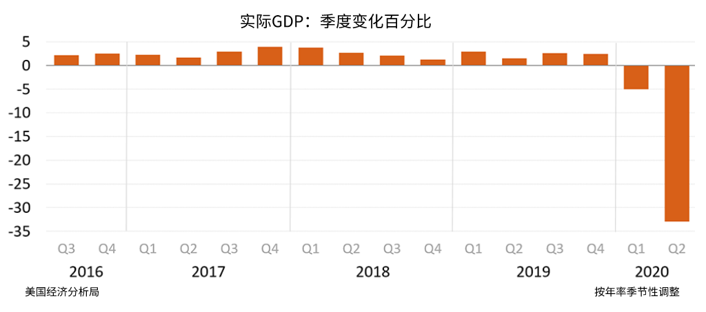 I  美国经济分析局( Bureau of Economic Analysis)发布的数据,2020年第一季度美国GDP下降了5.0%,这是自2008年金融危机以来最严重的收缩。第二季度GDP预测下降34.3%。