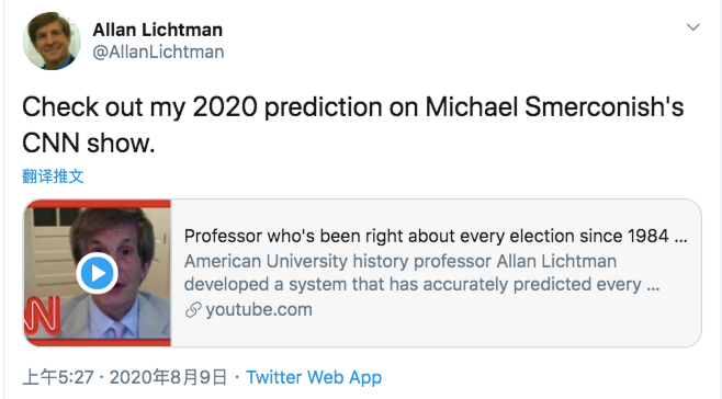 I  2020年8月9日(美国当地时间),利希特曼在Twitter上转发了自己接受CNN采访,预测美国大选的视频。