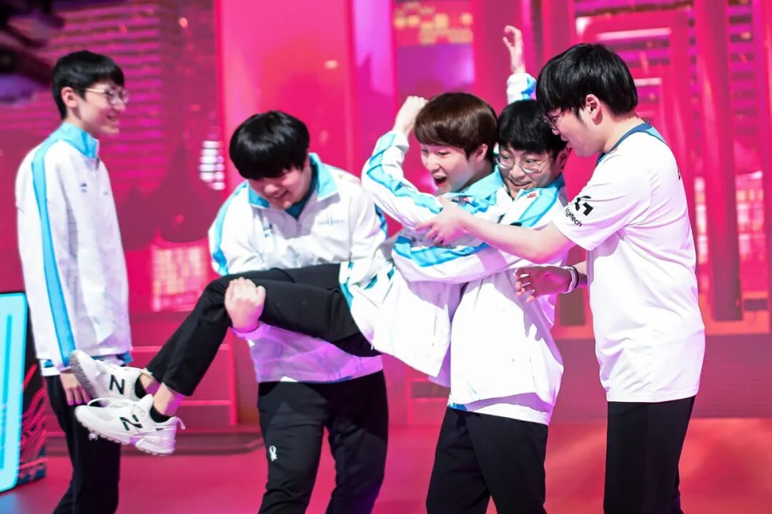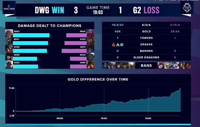 除了下路以外,G2最为关键的上中两路在今天的表现也着实有些不太好,上路的Wunder虽然第二局比赛里配合队友把牛宝的剑姬打到了0-7,但其他几局都被对手压制住了。最为核心的Caps也没能保持住自己神勇的状态,后两局比赛多次激进的进攻反而让Showmaker抓住了破绽。另外值得一提的是,这场BO5的第四局还创造了一个新的纪录,DWG仅用时19分03秒就推平了G2的基地,这是历届世界赛结束时间最短的一场比赛。