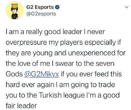 当然,要论犯罪程度,辅助Mikyx必然要扛下最大的锅,他在今天的BO5里出现了多次的失误。首局比赛的洛开局7分钟死了两次,直接导致下路炸线,第三局的潘森更是化身外卖小哥全场狂送,连一向乐观的G2官推都忍不住“警告”了他:“Mikyx,如果你再送的话,我就把你卖到土耳其联赛去。”