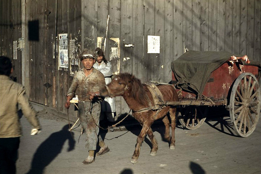 图为汉城的街头,当时摄影师主要是拍摄这个马夫和马车的。这个马夫身穿一套不合体的衣服,衣服上布满了污渍。马车上拉着一个大箱子,箱子上印有很多汉字。