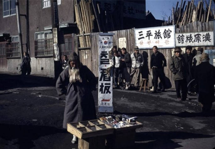 图为汉城街头一位韩国老大爷正在摆摊,在他边上的不远处一堆人聚集在一起。在一面木质的墙体上贴有汉原旅馆和三平旅馆的汉字招牌。