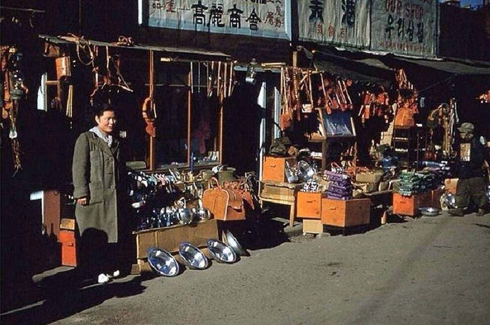 这是一组上世纪50年代初期韩国首尔的老照片,当时这里还叫汉城,那时这里的大街小巷随处可见汉字招牌。图为当时一家临街的杂货店,上面的三块店招有两块都是汉字书写的。