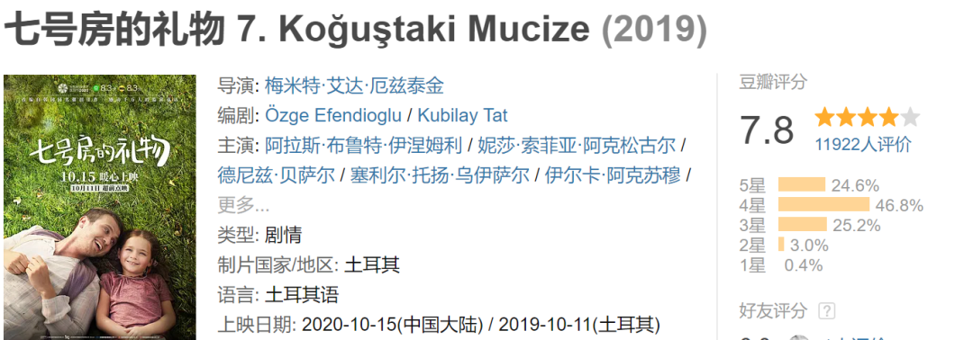 时隔七年,土耳其版《七号房的礼物》在当地一上映就几乎重演了原版当年受到的礼遇——在观众的泪水中成为2019年度票房冠军。豆瓣7.8分的评价也证明观众对这部影片改编的认可,不仅是感动,不少人还在评论中提到了土耳其醉人的美景。