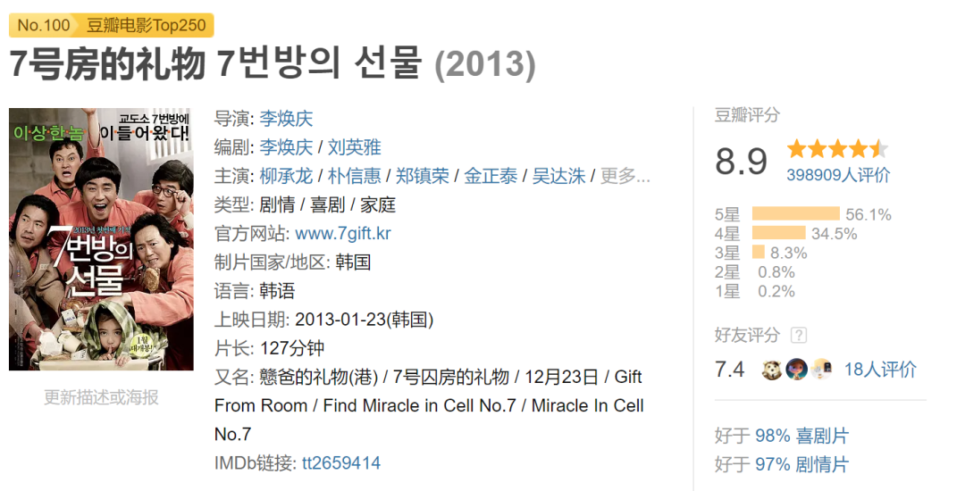 今天要说的这部电影,可能很多朋友在七年前就已经跟它产生了强烈的情感关联,为它流过不少眼泪。七年前,韩国电影《七号房的礼物》赚足眼泪,拿下韩国电影青龙奖最佳男主角、荣获百想艺术赏最佳编剧和韩国电影钟奖最佳男主。在豆瓣上,这部电影有将近40万人打分,90%以上的观众给出了四星以上的评分。
