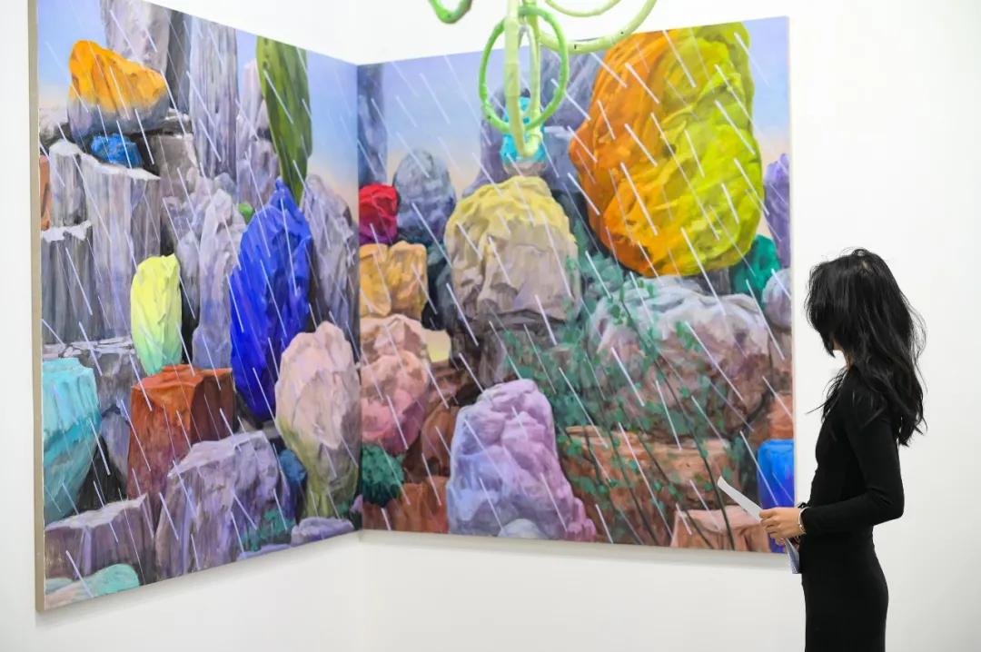 高古轩(Gagosian)在本次西岸艺博会上的展位是画廊今年三月以来首次参与线下举办的艺术博览会,因而也呈现了多位全球艺术家的作品,其中的大部分是为本次展会而创作的作品,此前从未进行展出。展位上,斯特林·鲁比(Sterling Ruby)以透明聚氨酯块为主要材料创作的装置《完全平静/多巴胺 完成,跑!》位于展位中的显眼位置,约翰·柯林(John Currin)与亚历克斯·伊斯雷尔(Alex Israel)的作品也引来多方问询。