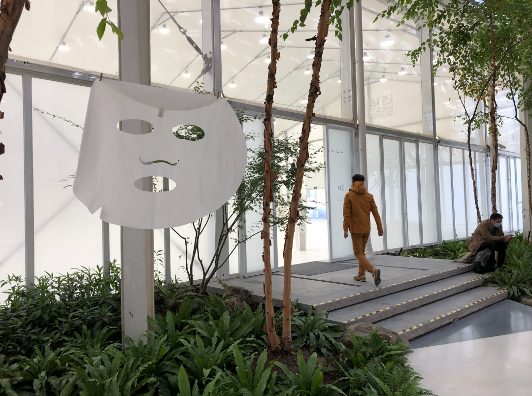 塞莱斯特·布谢-穆日诺(Céleste Boursier-Mougenot)的场域特定装置作品《矿物现实》(Paula Cooper Gallery)由粉碎的回收玻璃和大型可攀登岩石组成,创作出一个以视觉和声音元素构成的景观;观众们纷纷走进作品之中体验。除此之外,在绿植包围中的《美惠三女神》(颜石林,今格空间)与蔡泽滨的巨大面膜《微风》(胶囊上海)也十分吸睛。而梁绍基的蚕丝作品更是从香格纳画廊的个展延伸至整个西岸场馆的更多空间,自然的灵动与生命的脆弱感所形成的诗意哲思也引发观者对于2020年共鸣。
