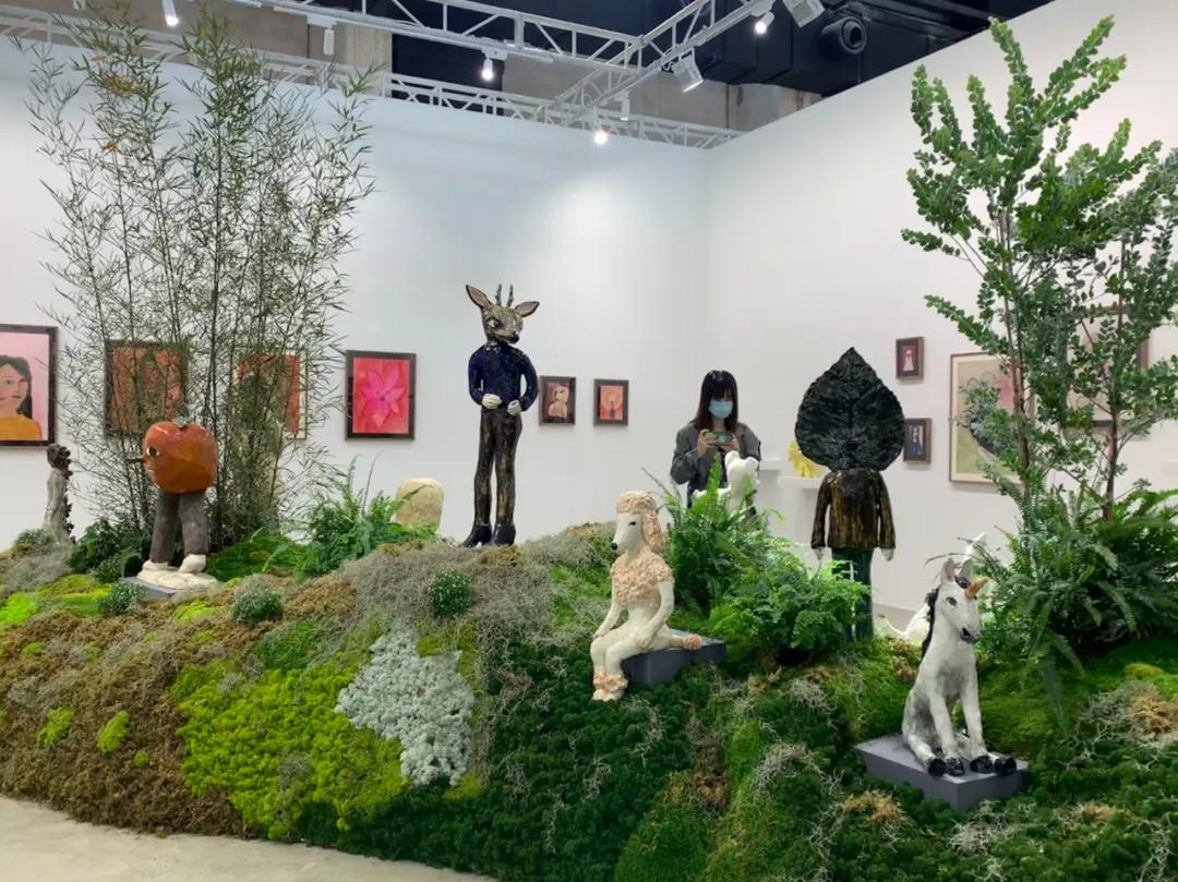 不少画廊已将西岸作为推陈单独艺术家的最佳场所,而多个趣味各异的个展也为展会增添了几分生动的叙事:贝浩登(Perrotin)携手瑞典艺术家克拉拉·克里斯塔洛娃(Klara Kristalova),在展位的中央搭建起了一座微型“动物园“。奇特的人物和小动物栖息在郁郁葱葱的绿色间,宛若一部童话故事。克里斯塔洛娃是一个讲故事的人,利用雕塑建立了一个不寻常的微观世界。在这个世界里,艺术家捕捉生活中无处不在的微小叙事,并以一种极度心理化的方式进行打磨创作,呈现出了一场奇特,甚至稍许令人不安的故事场景。其选用的材料透露着浓浓的传统雕塑创作和装饰性艺术气息。以这种贴近自然的材料及主体,作品邀请观众与其进行观看和密切对话。通过这种方式,让观众也被作品的意义所包裹,步入艺术家的精神世界。