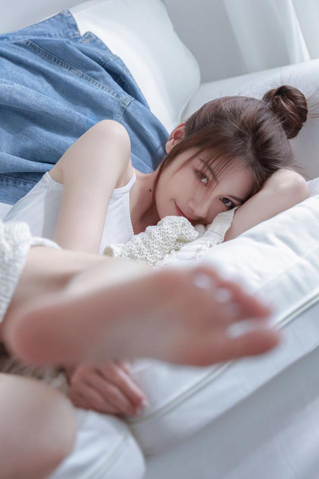 在家拍照的氛围很轻松,所以在拍摄时不要太拘谨了,如果你不喜欢刻意的摆拍那就和动起来和镜头来个互动,比如假装用手去挡镜头,亦可以用脚放在镜头前作为遮挡,怎么舒服怎么摆即可。