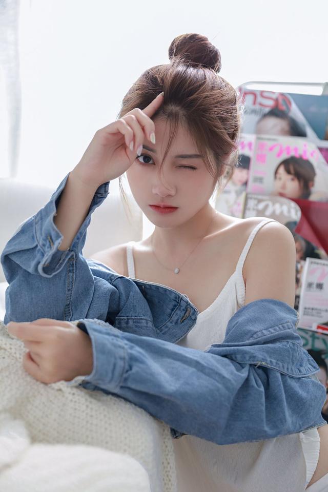 镜头感比较好的女生不要忽略了自身的优势,在家拍照可以将眼神自然地看向镜头,学下面的女生一样,依靠着墙面,手里面那本杂志,画面很安静唯美,即便简单的看向镜头也能上镜好看。