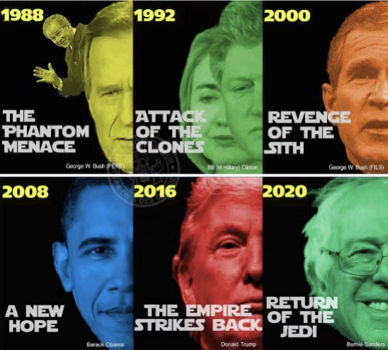 虽然是恶搞,但也是神奇的比喻,甚至可以说是一种「预言」。如果我们将共和党和民主党视作《星战》中的帝国和反抗军,那么老布什(《幽灵的威胁》、克林顿夫妇(《克隆人的进攻》、小布什(《西斯的复仇》)、奥巴马(《新希望》)、特朗普(《帝国反击战》)无论从主题上还是从时间线上,竟然和《星球大战》六部曲的人物、故事序列惊人地一致。该网站认为2020年的剧情会是《绝地归来》,可能因为个人倾向,作者将伯尼·桑德斯视为新的救世主,今天我们知道,是小约瑟夫·拜登接替了他「绝地归来」的任务。