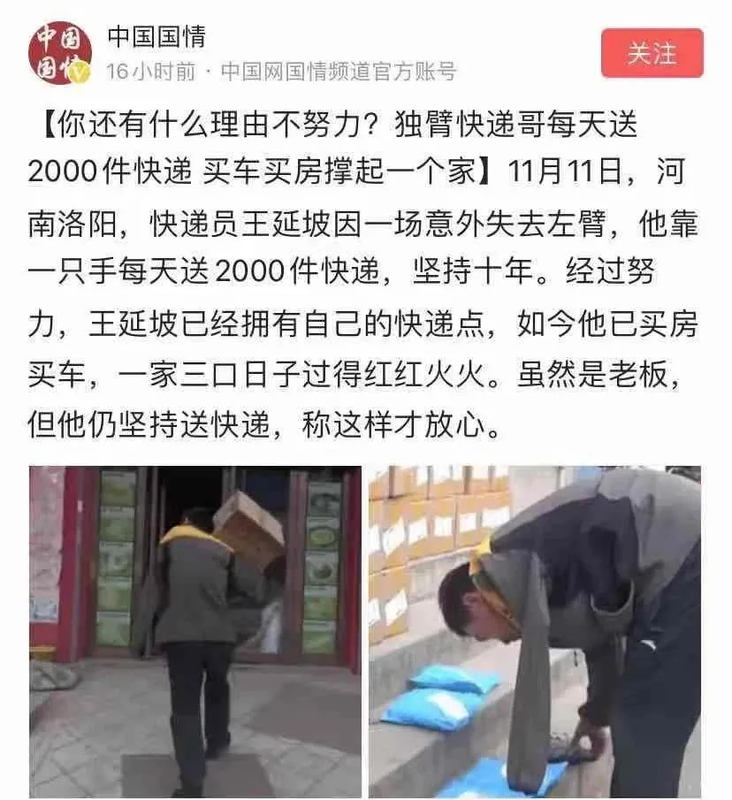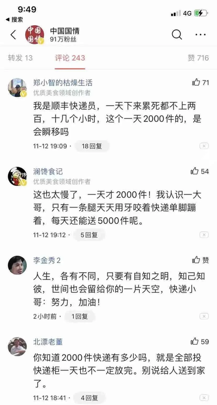 结果评论大翻车,毕竟中国网民虽然素质不高,小学数学还是会算的。一天2000个快递,就算不睡觉24*60=1440分钟,2000个快递每个平均用时0.72分钟43.秒,这不是送快递的,这是闪电侠。
