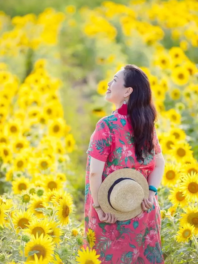 女人一旦迈入中老年,脸上的皮肤就会开始松弛,拍摄一些近景风光人像时,仰头的拍照技巧可以帮你避免拍出双下巴和松弛感,让仰头的姿势将下巴的肉撑起,幅度不用太大,以45度为佳,也是到花海旅行赏花的必备姿势。