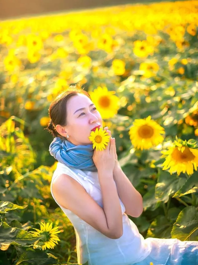 在花海中拍照时,很多的中年女士都喜欢以高机位的俯拍人物,但俯拍的角度很容易拍出五官扁平,显矮的效果,在技巧方面我更推荐您坐下拍侧颜,这样就能很好地避开拍照显矮的话题,还能更凸显你的五官和颈部线条,怎么拍都很美。