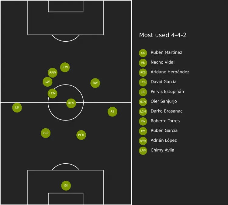 埃斯图皮尼安可以说是奥萨苏纳最需要的那种边后卫——能量十足,可以在左边路上下翻飞。事实上,当我们看到奥萨苏纳球员的站位图,不难发现埃斯图皮尼安在场上站位很高,很靠边,而剩下的中前场球员都在中路,把空间留给了身后的边卫。