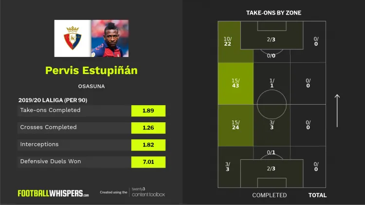 作为一个擅长带球推进的球员,埃斯图皮尼安平均每90分钟能够完成1.89次过人,该数据在西甲所有左边后卫中排名第三。同时,在尝试突破榜上,他以3.37次排名第二,排名第1的是皇马边后卫门迪(3.6次)。