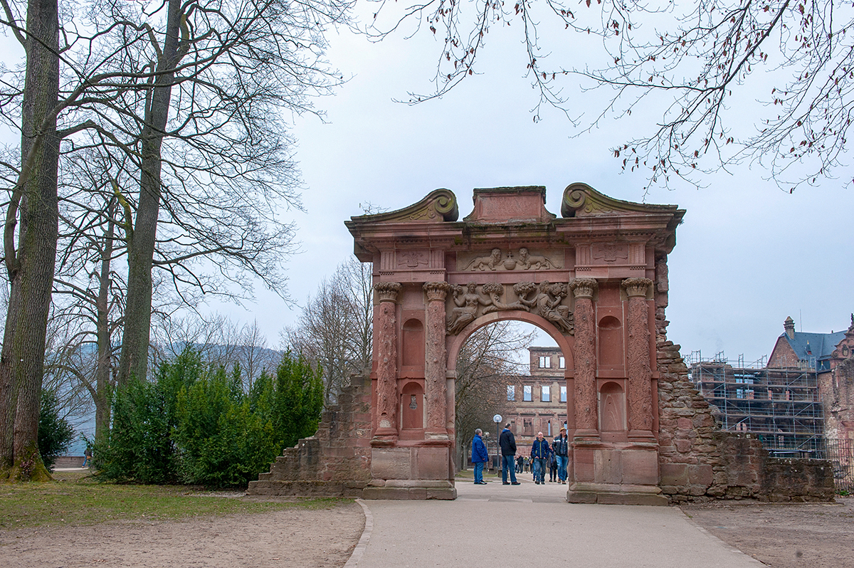 踏着石板小路,进入红褐色的城堡废墟,首先映入眼帘的是一座没有了围墙的城门,名为“伊丽莎白门”,建于1615年,当时的国王弗里德里希五世为了向他的王后、来自英国的伊丽莎白公主表达爱情,在她19岁生日时,下令在一天之内建起这座大门,门楣上镌刻着“献给最心爱的妻子伊丽莎白”,颇具浪漫色彩。