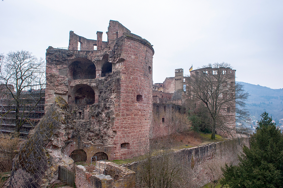 历史上,海德堡城堡经过几次扩建,形成了巴洛克、哥特和文艺复兴三种风格的混合体。城堡内部结构复杂,既有防御工事,也有供居住的宫殿和城堡花园等,在当年是重要的军事要塞,也是选帝侯宫邸。很多人会想当然地认为这是二战时被毁的,其实不然,海德堡是在1693年的战争中被法国人用火药炸毁的,照片中的这处建筑被炸成两半,却裂而不毁,塌陷的一部分依然斜靠在未倒的那一大半上。