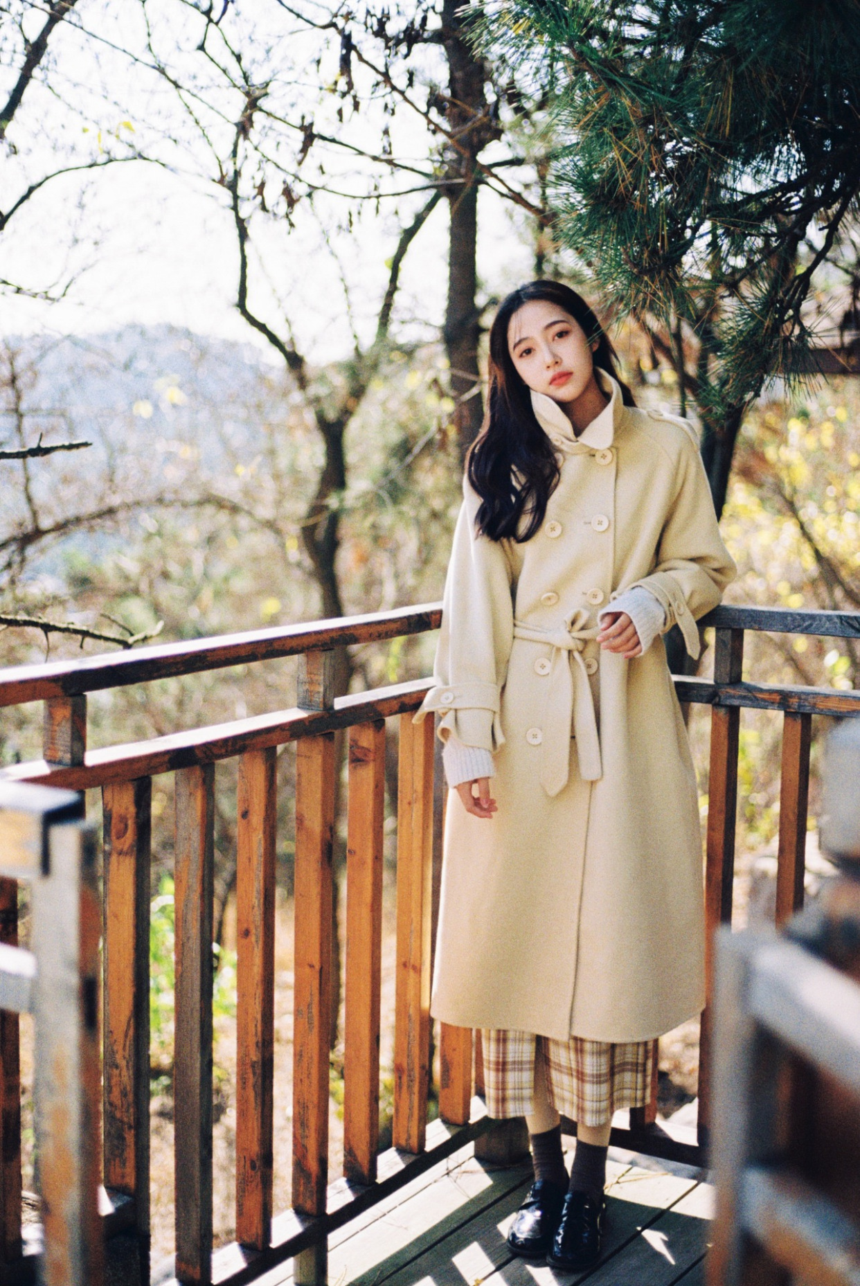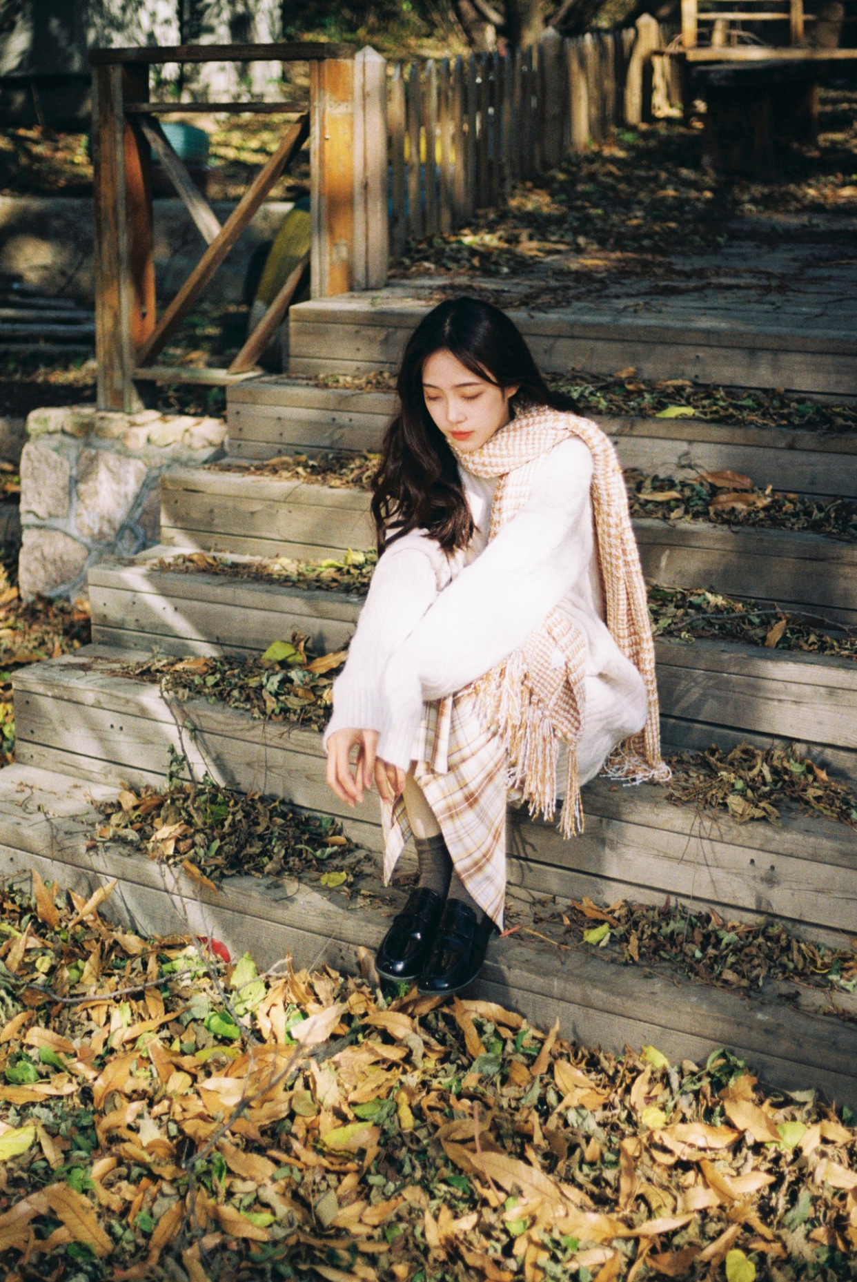 拍摄写真照时,找到配合题材的恰当背景可以事半功倍,所以在背景的选取上要讲究,比如秋季拍摄文艺秋叶人像写真,那么满是落叶的地面或楼梯就很不错,不用太纠结姿势,即便安静地坐着也能拍出不错的画面效果,满满文艺范。