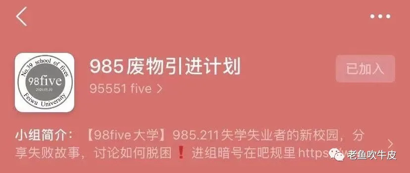 小组简介是这样的写的:98five大学:985.211失学失业者的新校园,分享失败故事,讨论如何脱困。