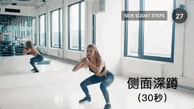 双脚与髋同宽分开站立,保持你的背部挺直,核心收紧,双手握拳放在自己的胸前,臀部向后坐屈膝到半蹲,双腿交替向侧方移动,动作过程中保持膝盖与脚尖方向一致。