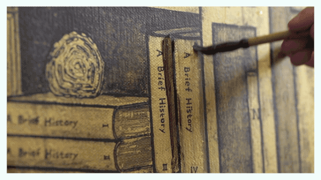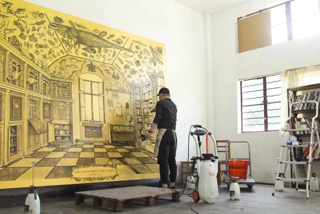 另一边蓝灰调子的画,出自艺术家汪建伟的《寒武纪》系列。