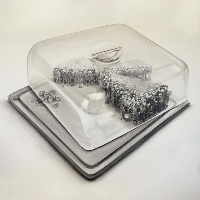 88年出生的陆超,画守在家乡的老人和孩子,给他们罩上一个塑料蛋糕罩,“瞭望得到外面的世界,但又走不出去”。