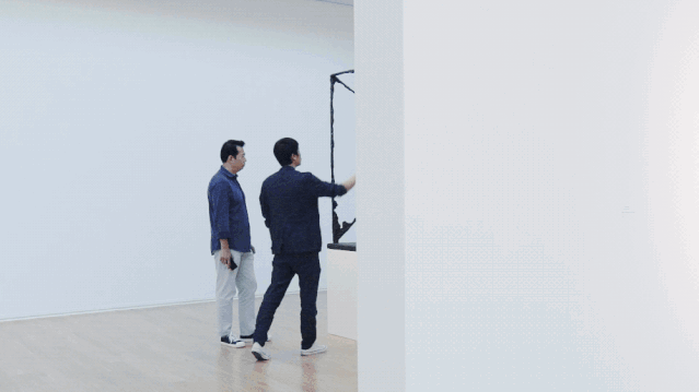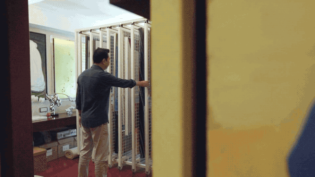 展示这些画作的过程充满了仪式感。在关东元指挥下,大伙儿得先都站去房间的一边,他自己则站在另一边,把画从轨道上一张张向外拉。展示过程过半,两方人马要掉换个位子,再抽出另一半画架上的画。