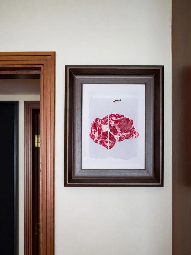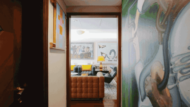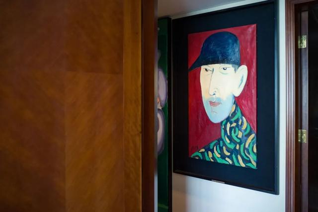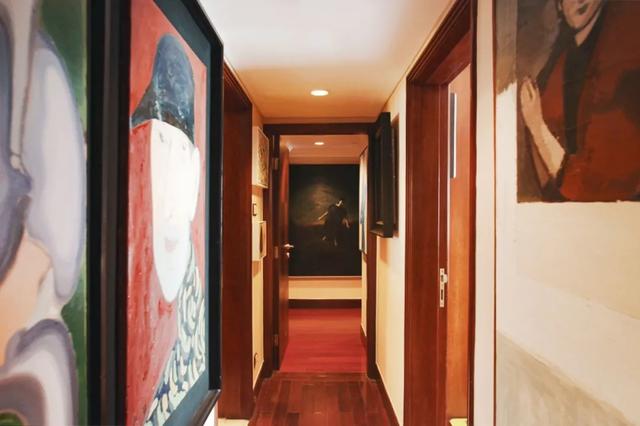 客厅再往里走,就是两个卧室和两间卫生间,而串起这四道门的走廊,汇集了关东元这些年购买的画作。穿过走廊时,被浓郁的色彩包围。
